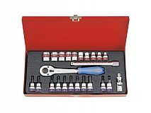 Основная разновидность рабочих насадок сборного слесарно-монтажного инструмента - это торцевая головка. Торцевые головки разделяются по геометрии рабочего профиля, по длине и по назначению. Такие инструменты обеспечивают наилучшие условия для приложения рабочего усилия по сравнению с другими видами инструмента для работы с внешними рабочими профилями. Двенадцатигранные головки удобнее в применении по сравнению с 6-гранным, так как какой профиль предоставляет большую свободу для позиционирования головки на крепеже. Однако, он обладает меньшим по площади пятном контакта и воздействие на крепеж, особенно с высокой нагрузкой, может повредить грани крепежной детали, что в сочетании с большим количеством концентраторов напряжения несколько ограничивает применяемые максимально допустимые нагрузки, опять же, по сравнению с 6-гранными головками. Торцевая головка выполнена из хромованадиевой стали, имеет накатку и полуматовое хромоникелевое покрытие. Изделие изготовлено по стандарту DIN 3124, полностью соответствует требованиям ГОСТа 25604-83.
